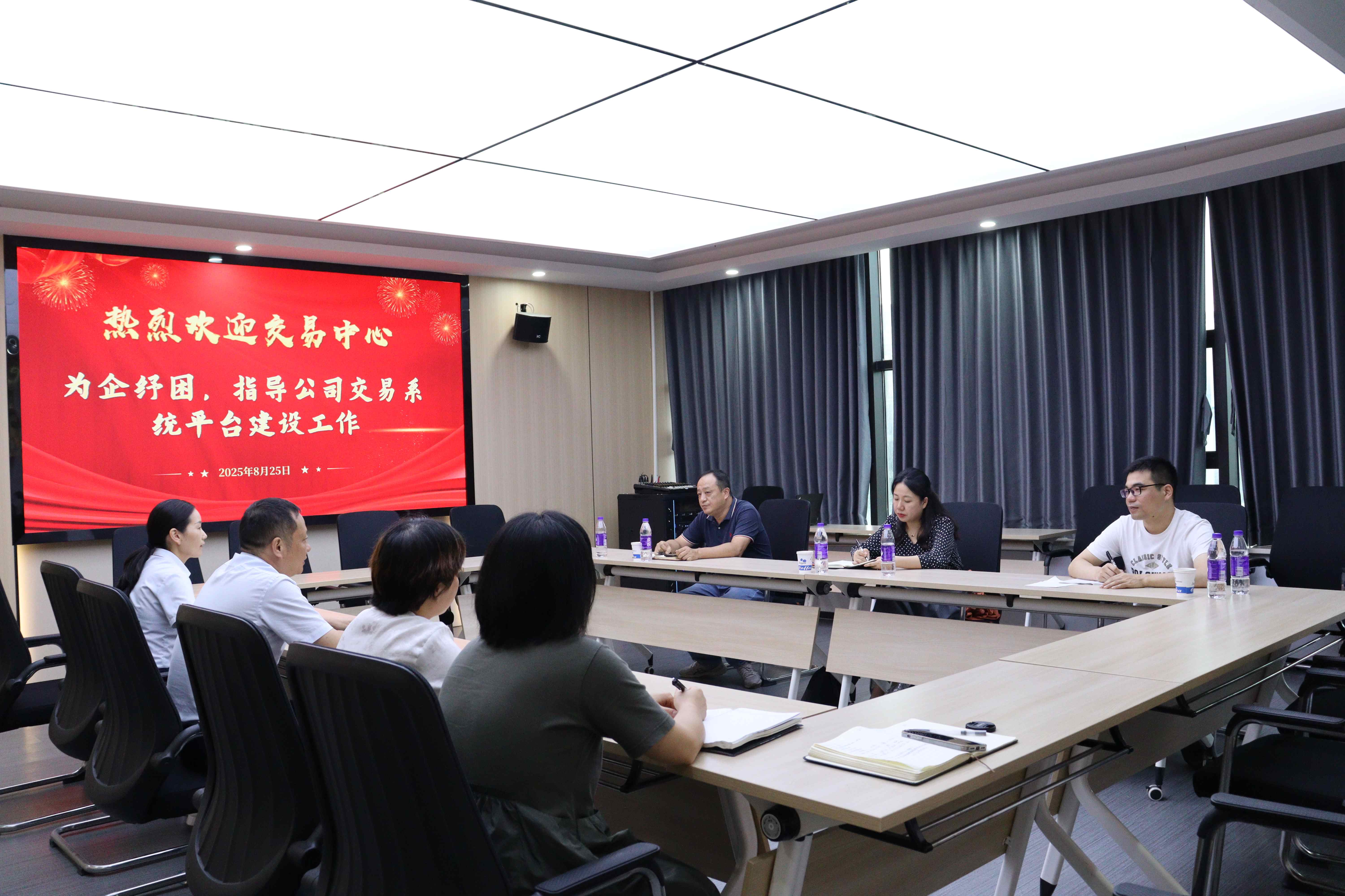 8月25日下午,市交易中心主任劉媛媛、副主任楊克一行蒞臨我司,圍繞非進(jìn)場項目交易平臺的系統(tǒng)和場所建設(shè)開展調(diào)研指導(dǎo)并交流座談。